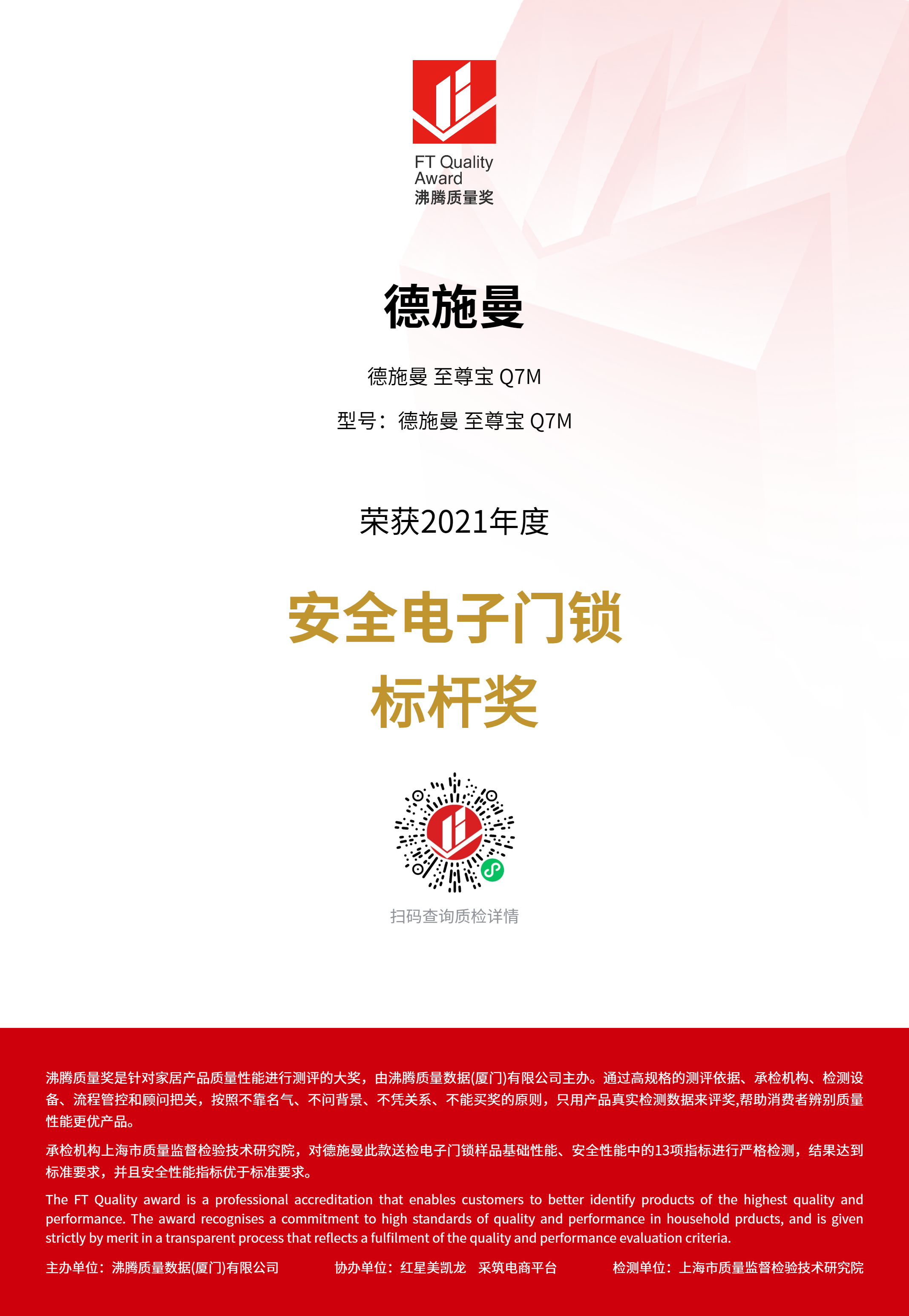 2022年3月15日,備受家居行業和市場矚目的2021年度沸騰質量獎測評獲獎結果,在“3·15家居品質節暨沸騰家居質量周”上重磅揭曉。德施曼3D人臉視頻鎖至尊寶Q7FPro榮獲“沸騰質量金獎”、貓眼款至尊寶Q7M獲“安全電子門鎖標桿獎”、至尊寶Q7獲“靈敏電子門鎖標桿獎”、天鵝Q2獲“節電電子門鎖標桿獎”。德施曼“沸騰質量獎”再添一項金獎、三項品質大獎!