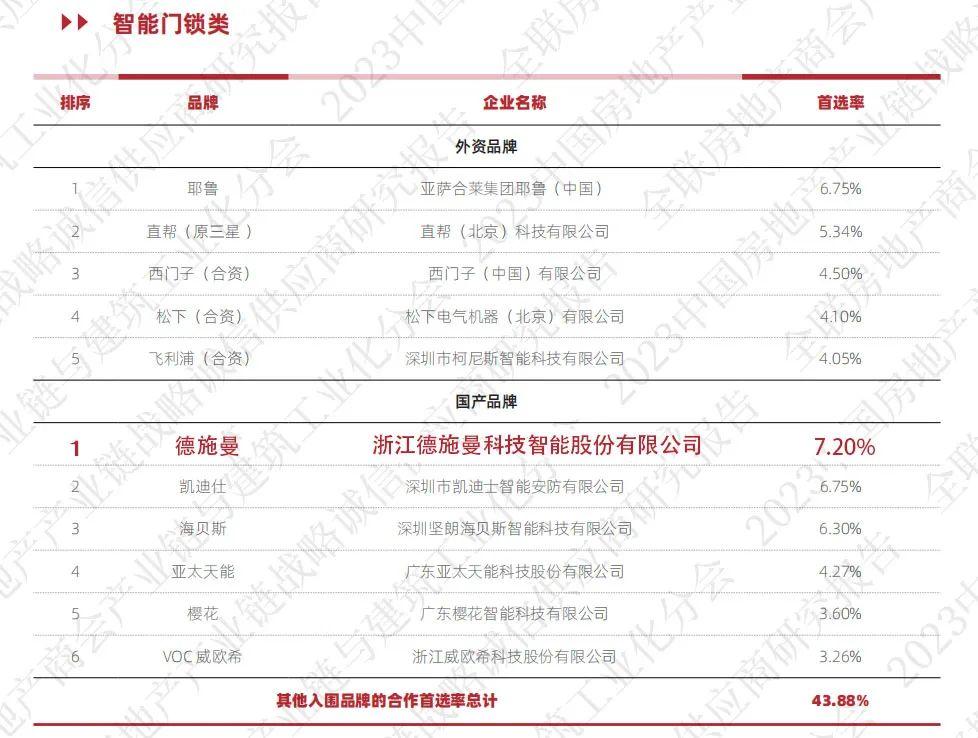 現場《2023中國房地產產業鏈戰略誠信供應商研究報告》重磅發布,國產高端智能鎖品牌德施曼憑借過硬的產品品質,以7.20%的首選率,斬獲“2023中國房地產產業鏈戰略誠信供應商”大獎,位列國產品牌TOP1!