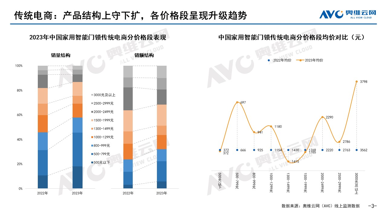 新興渠道:當下,新興渠道蓬勃發(fā)展,各行業(yè)積極拓展,中國家用智能門鎖行業(yè)也不例外。據(jù)奧維云網(wǎng)(AVC)線上監(jiān)測數(shù)據(jù)顯示,2023年,新興渠道在線上市場的比重進一步提升。其中,零售量占比為29%,較去年提升4個百分點;零售額占比為24%,較去年提升6個百分點。且從價格段結構看,新興渠道高端產(chǎn)品占比增加,也是帶動其全年均價上漲的主要原因之一。