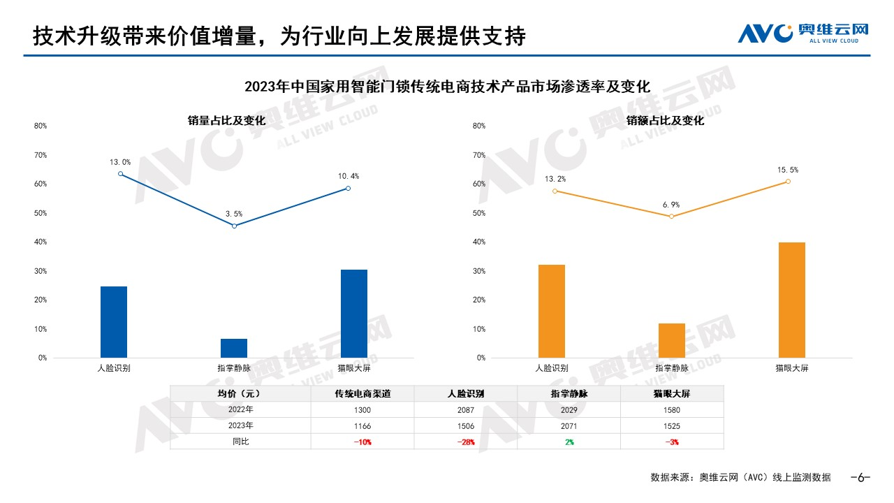 據(jù)奧維云網(wǎng)(AVC)線上監(jiān)測數(shù)據(jù)顯示,傳統(tǒng)電商渠道新技術產(chǎn)品滲透度持續(xù)提升,其中,人臉識別零售量占比為24.7%,較去年增長13.0個百分點;指掌靜脈零售量占比為6.6%,較去年增長3.5個百分點;貓眼大屏零售量占比為30.4%,較去年增長10.4%。對比傳統(tǒng)電商渠道均價,技術產(chǎn)品的價格更高,可為行業(yè)帶來更多的價值增量。